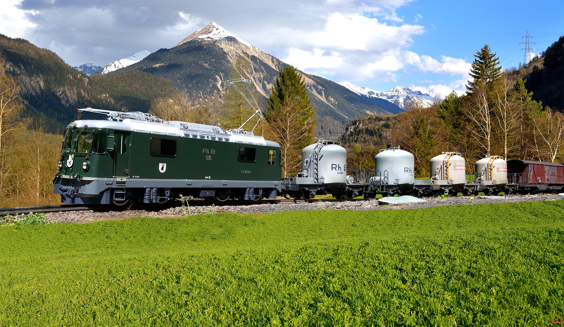 Vor der Muchetta Pyramide zieht die Ge 4/4 II 616 FILISUR einen gemischten Güterzug