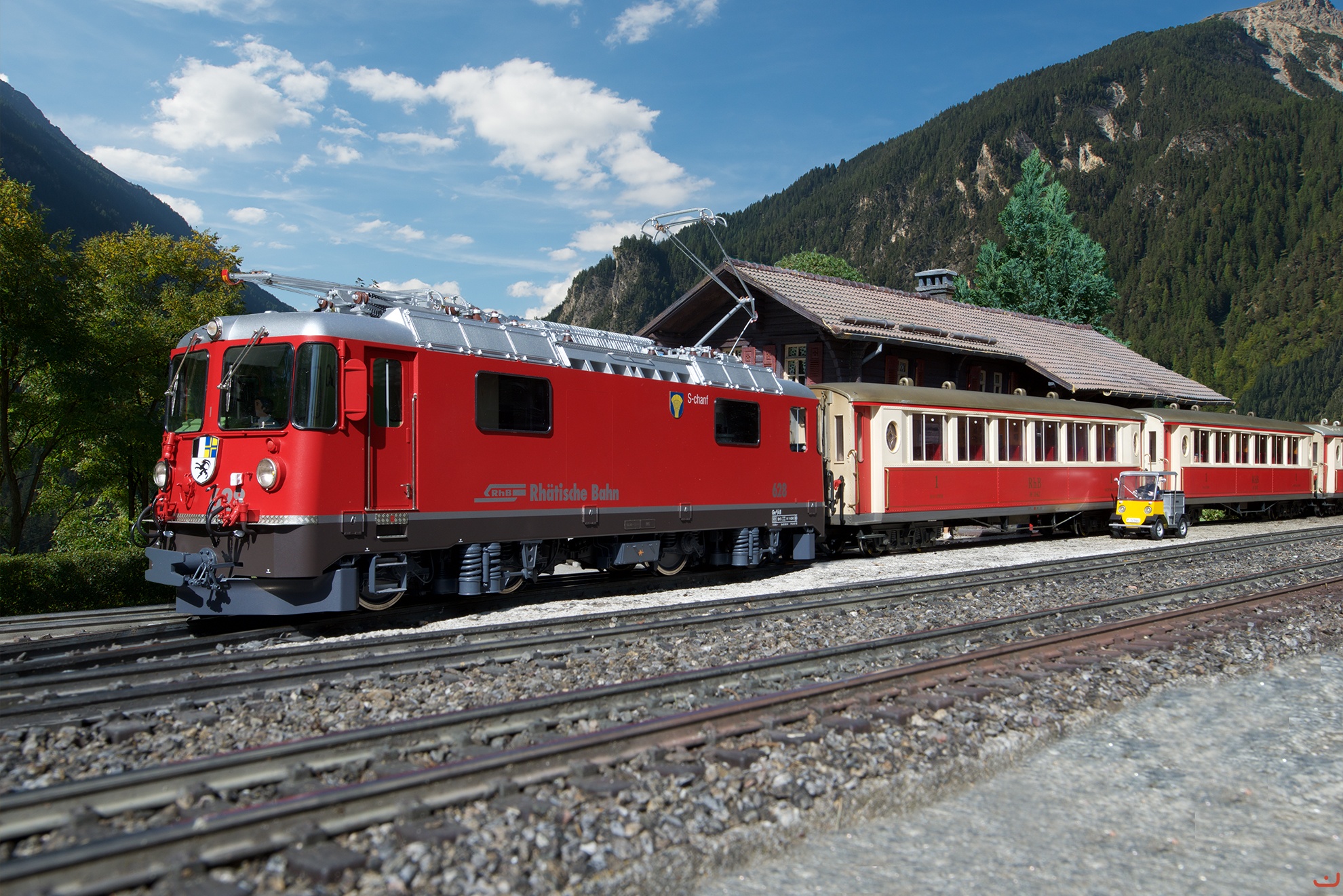 Die Kiss RhB Ge 4/4 II S-chanf mit einem Extrazug aus Salonwagen wartet die Kreuzung in Filisur ab.