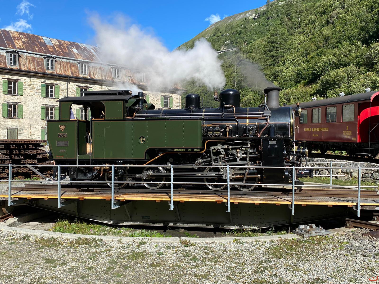 22.8.2020 Grosses Dampfbahnfest bei der DFB. HG 4/4 704 auf der Drehscheibe von Gletsch Foto: Klaus Himmelreich