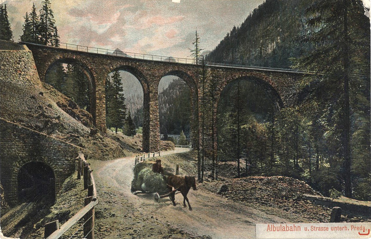 Albula Bahn und Strasse mit Pferdefuhrwerk um 1909. Sammlung Herbert Cadosch