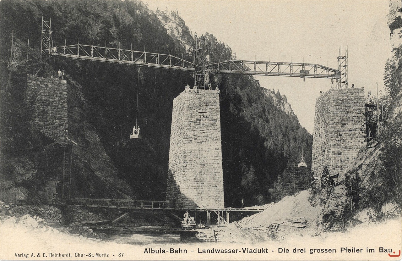Albula Bahn Bau des Landwasserviaduktes um 1901. Die drei grossen Pfeiler sind noch nicht weit fortgeschritten. Sammlung Herbert Cadosch