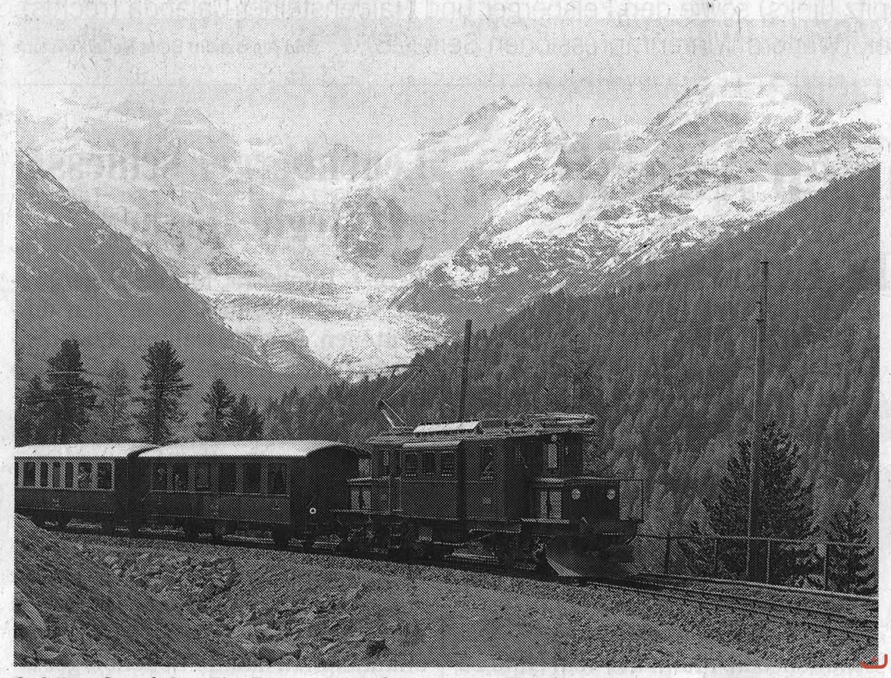 Ein Personenzug mit dem Bernina Krokodill Ge 4/4 182 in der Montebellokurve. Bild Bernhard Studer 1976