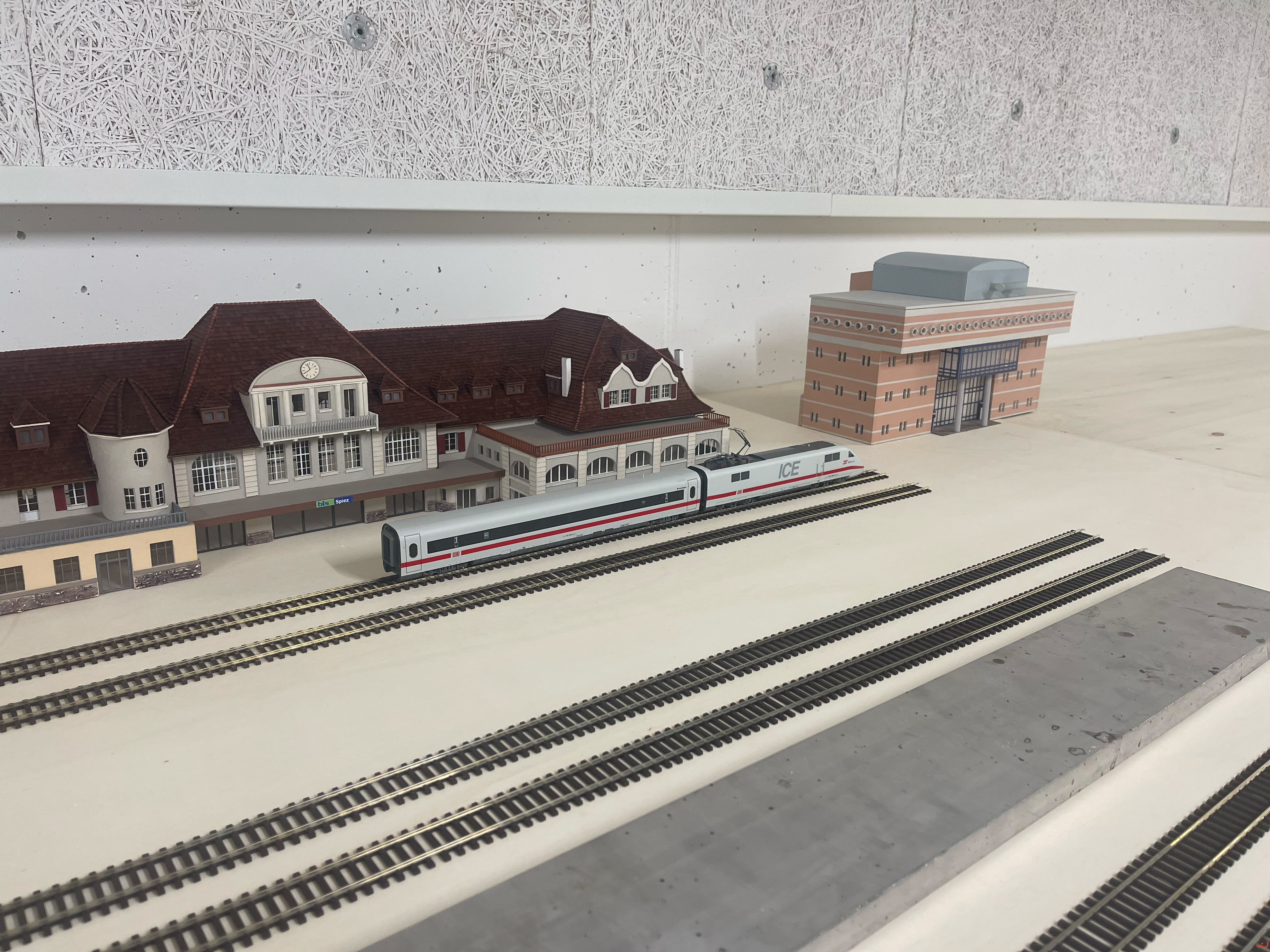 Nochmals Probelegen – diesmal bereits deutlich präziser. Der Platz für die zukünftigen Bahnsteige ist bereits berücksichtigt und freigehalten. Und wie die spätere Bahnhofsszenerie einmal wirken wird, lässt sich jetzt schon gut erahnen.