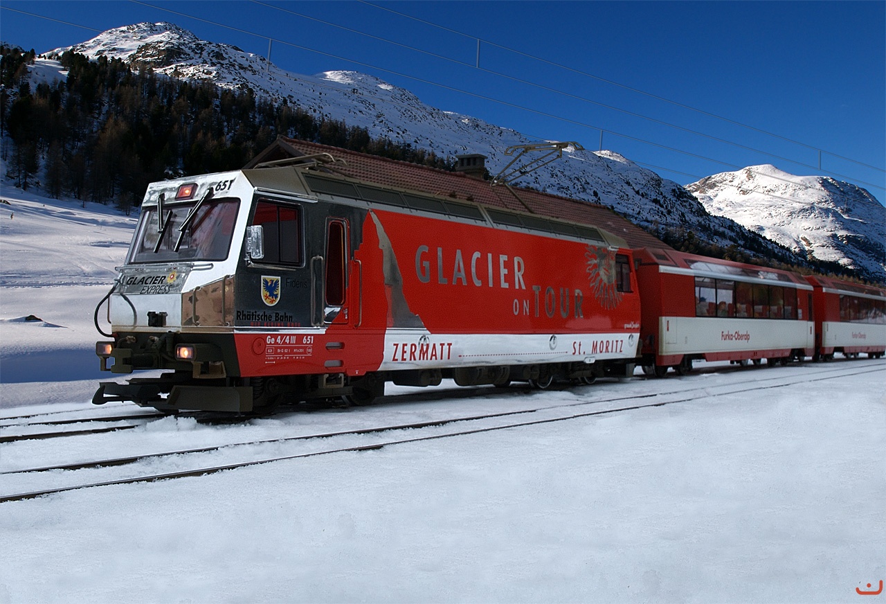 LGB RhB Ge 4/4 lll 651 mit den FO Panoramawagen an einem schönen Wintertag. 2.3.2010