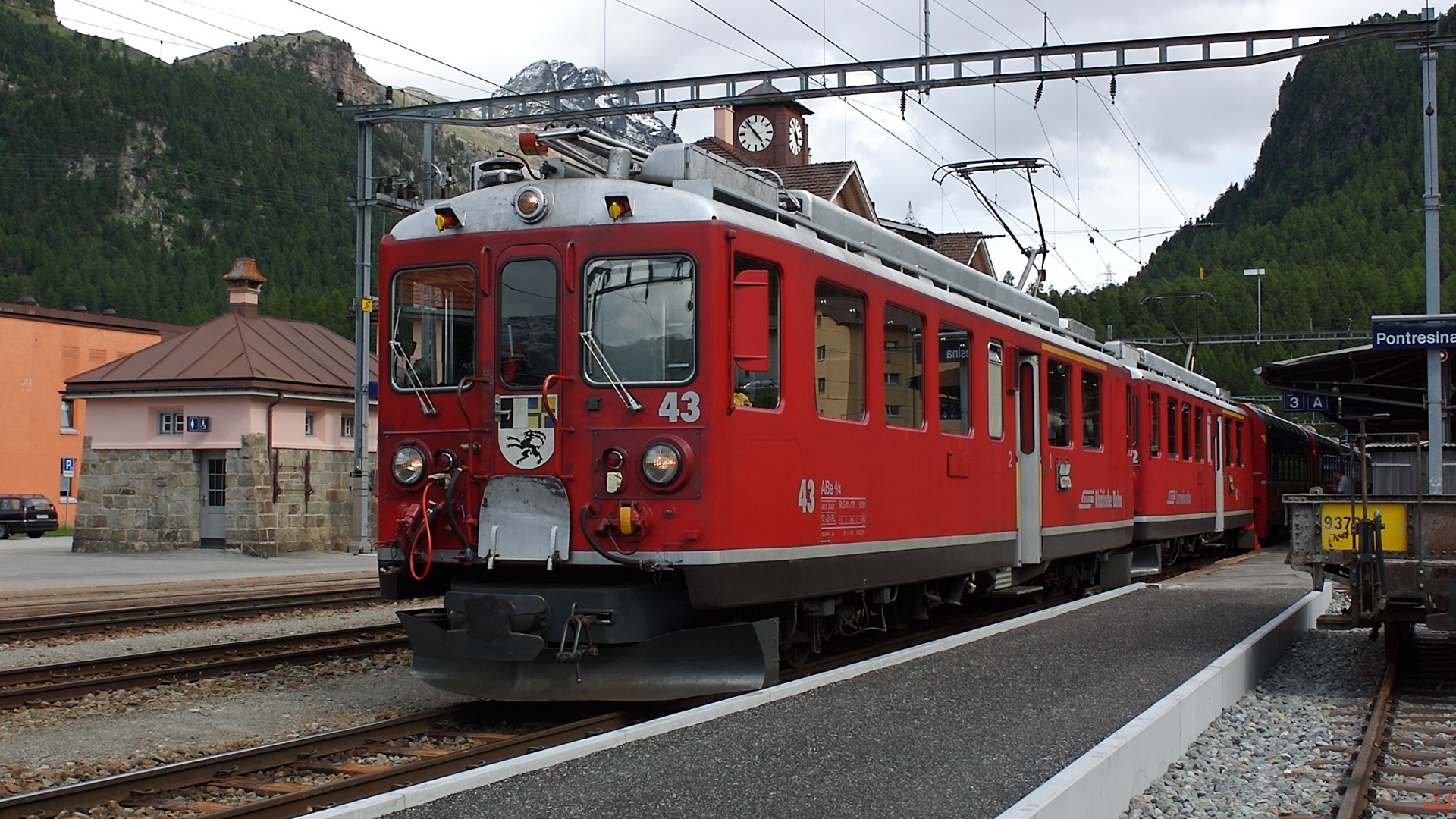 ABe 4/4 ll 43 und 42 mit einem Regionalzug von Tirana nach St. Moritz am 11.7.2004 in Pontresina.