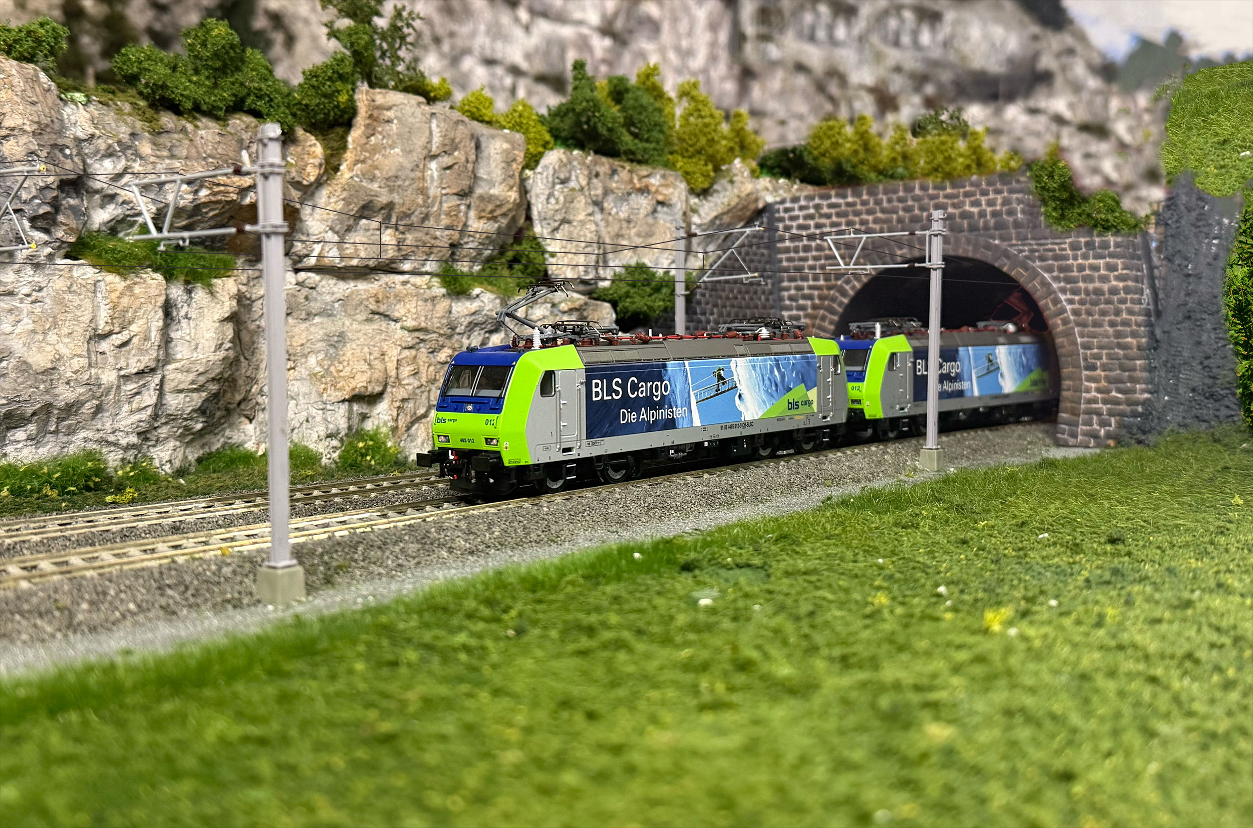 Reiner Zufall, dass das neue Titelbild dem der alten Anlage ziemlich ähnelt: Zwei Re 485 der BLS, talwärts beim Verlassen des Felsenburgtunnels I