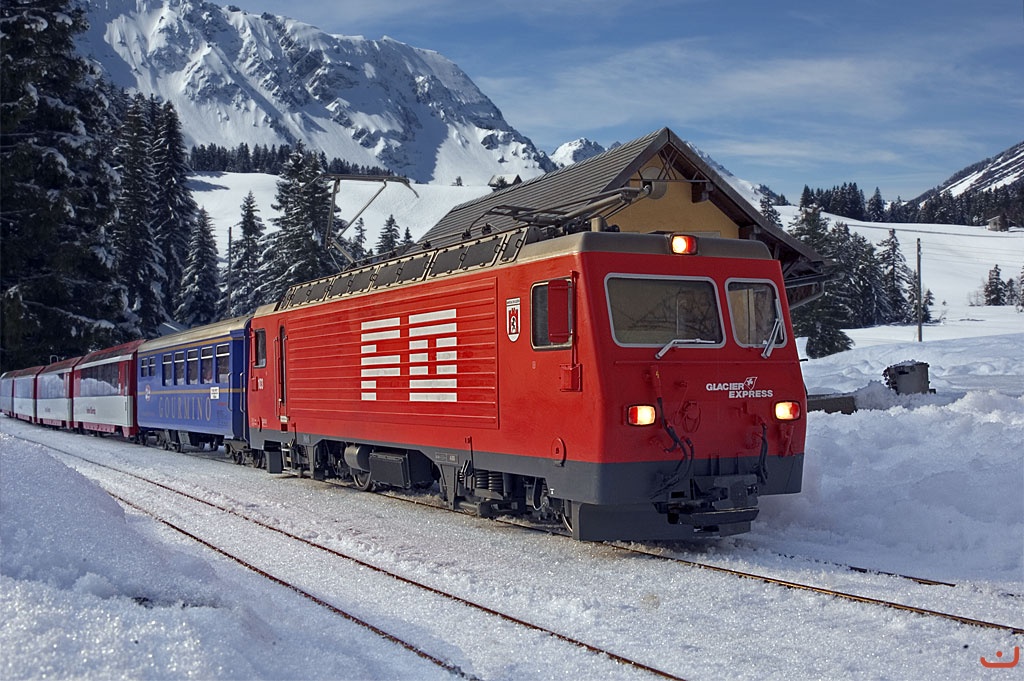 Der Glacierexpress mit einer KISS HGe 4/4 II durcheilt das Goms. Die Wagen sind von LGB.