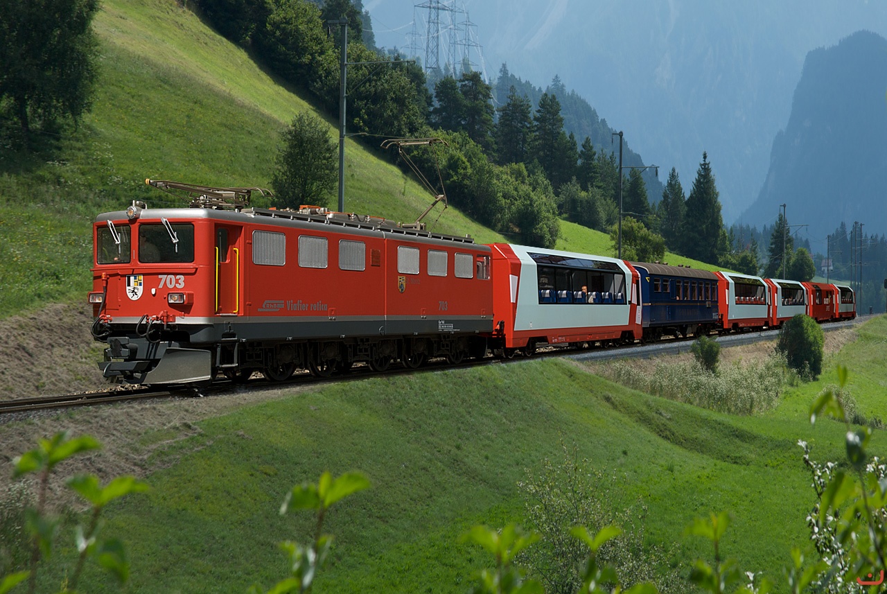 Doppel Glacier Express mit KISS Ge 6/6 II 703 und LGB Panoramawagen "oberhalb" von Surava. 10.7.2010