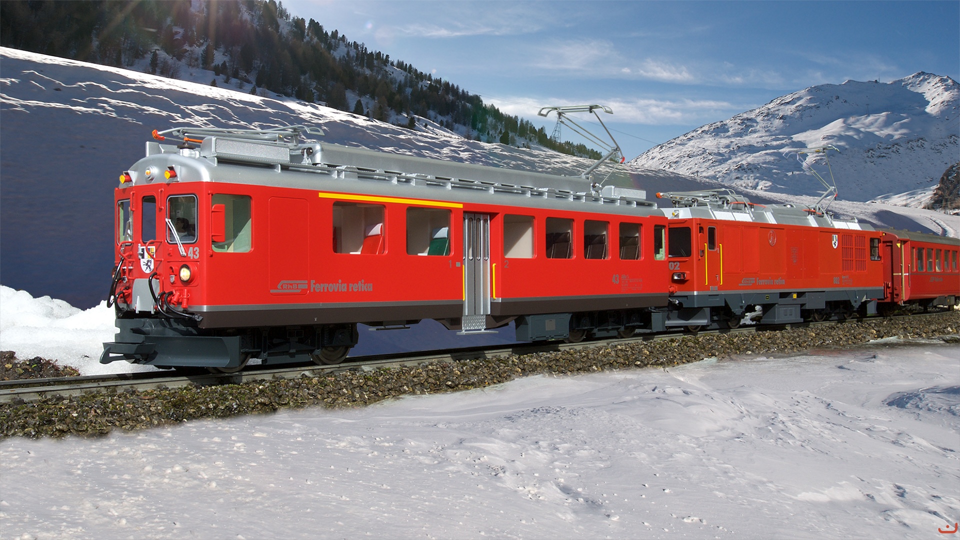 Auch mit einer Gem 4/4 zusammen macht ein ABe 4/4 ll eine gute Figur. Regionalzug mit ABe 4/4 ll und Gem 4/4 802 kurz nach der Station Diavolezza. 24.3.2016