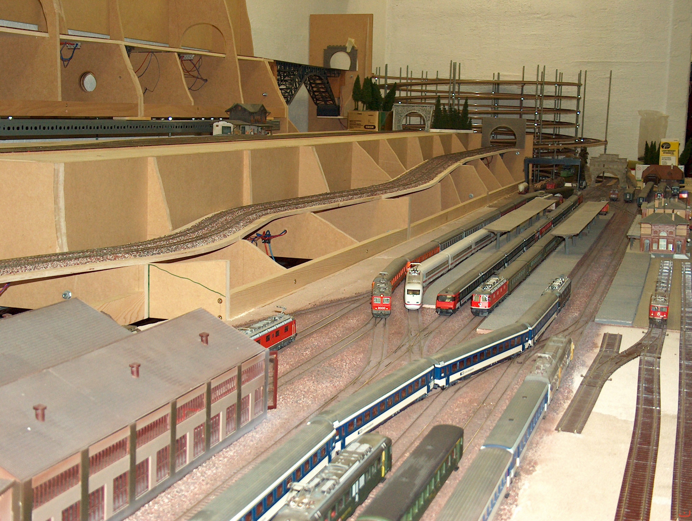 Ansicht vom Hauptbahnhof Spiez mit der Ausfahrt nach Bern und zur rechten Anlagen Seite mit der 11 - fach Wendel die nach dem befahren des Bietschtalviaduktes von den Zügen in Angriff genommen wird.