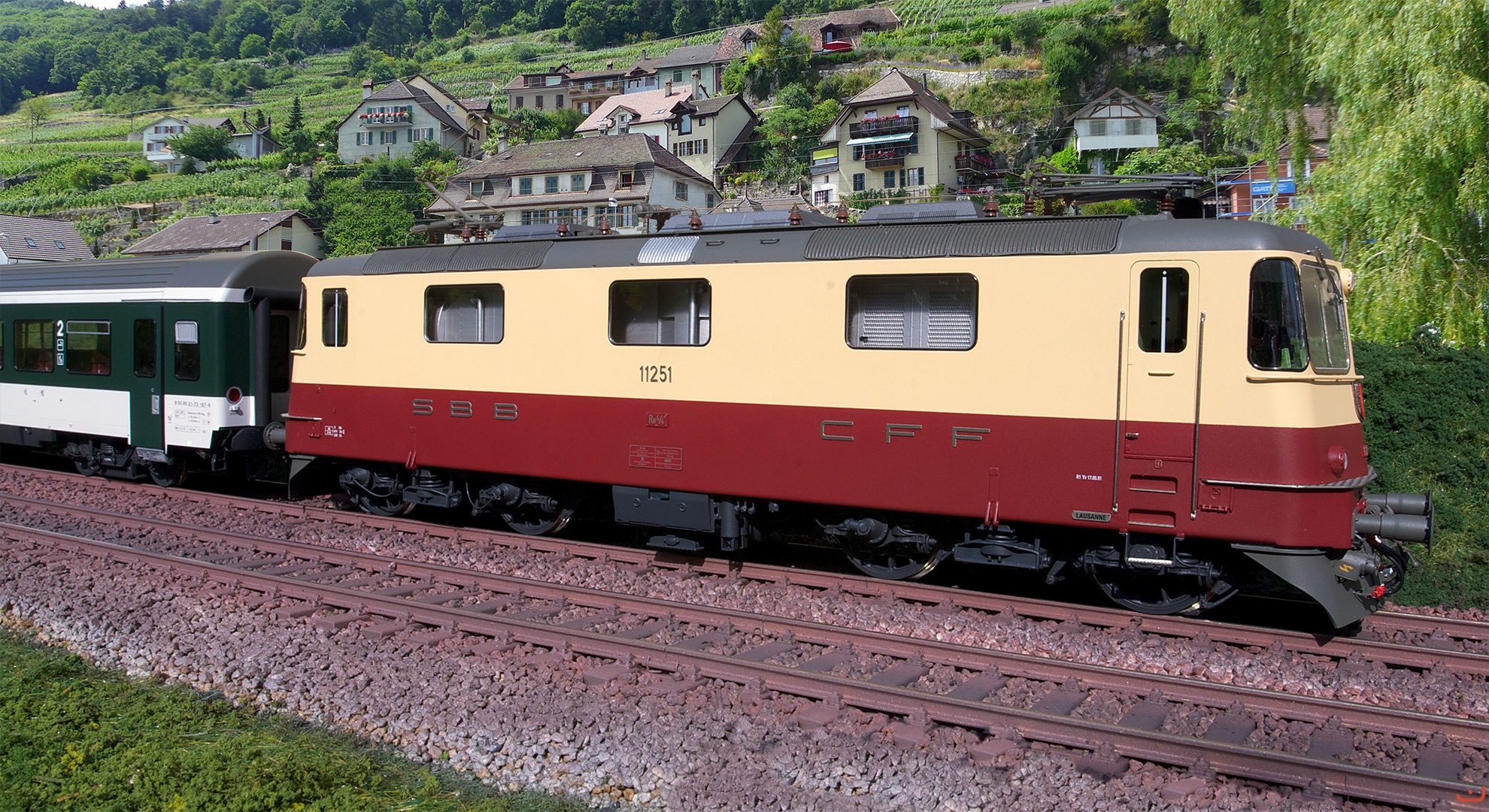 IC Genf-Basel SBB mit Re 4/4 11251 vor den Weinbergen am Bielersee kurz vor Biel (Chavannes 19.2.1991)