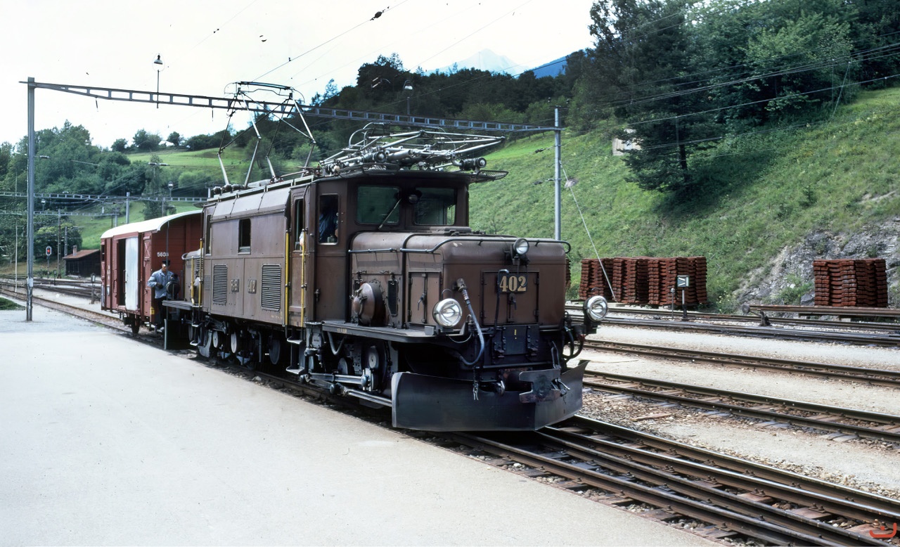 Ge 6/6 402 mit einem kurzen Güterzug in Filisur um 1972